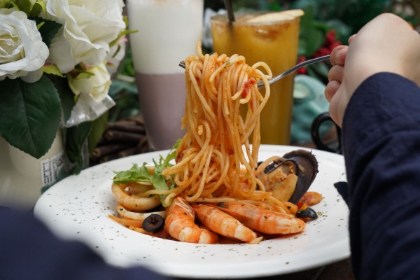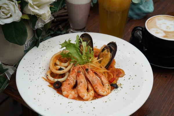 綜合海鮮佐橘醬義大利麵的套餐,有花枝、淡菜、蝦子,