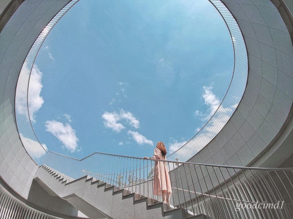 以鳳凰花轉化五角造型的「台南美術館二館」落成以來一直是IG上的打卡熱點,近期網友發現了這個「通往天國的階梯」的超仙秘境,竟然就在美術館的停車場,簡約灰白色的階梯搭配湛藍天空,真的有夠美啦!