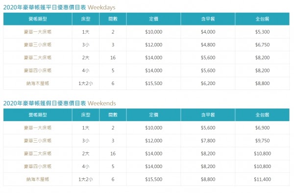 此優惠價格適用到2020/12/31止,直接下殺將近4折,平日住宿還更划算,平均每人最低只要1400元,如果要加全包餐再額外加錢!快趁著假日來這邊享受露營樂趣吧!