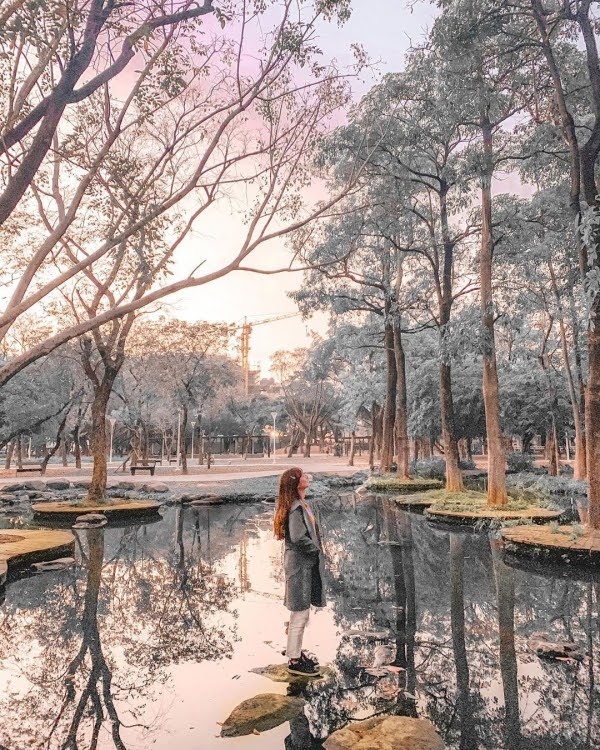 園區占地約9公頃多,最吸睛的就是中間的生態池了,許多人都會到這邊打卡拍照,尤其是黑板樹木的圓形木棧板,水面映照了直挺挺樹的倒影,拍起來非常有林蔭之美!