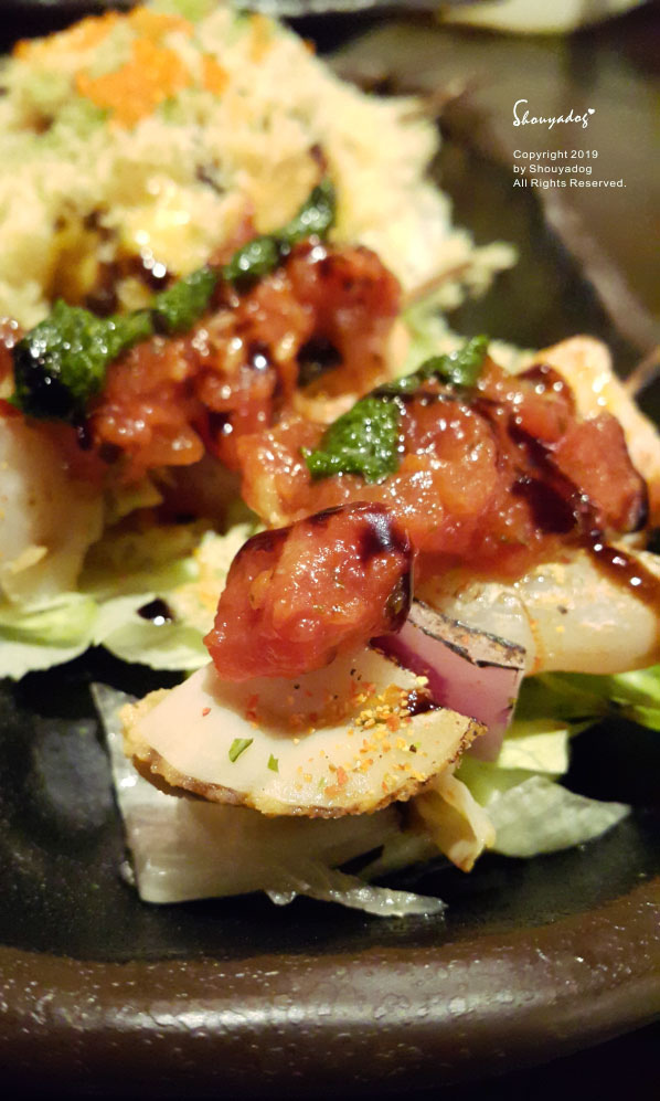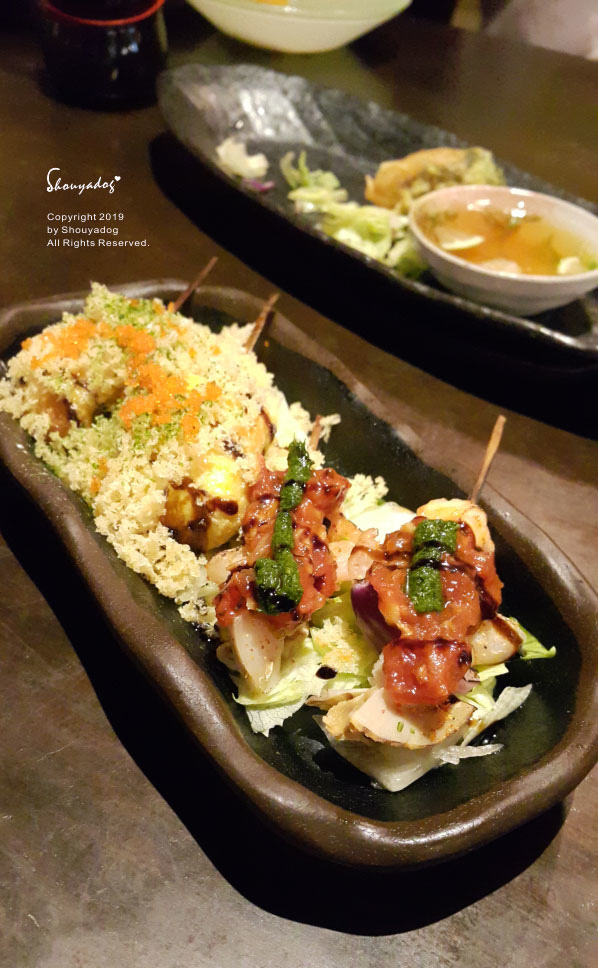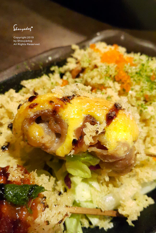 另一邊撒滿天婦羅的酥脆屑屑和蝦卵的是五花馬格麗特串。
