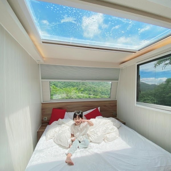 每一台露營車除了有一房一陽台的獨立空間外,還貼心設置了電動觀星天窗,讓你夜晚躺著就能看滿天星斗,好浪漫啊!