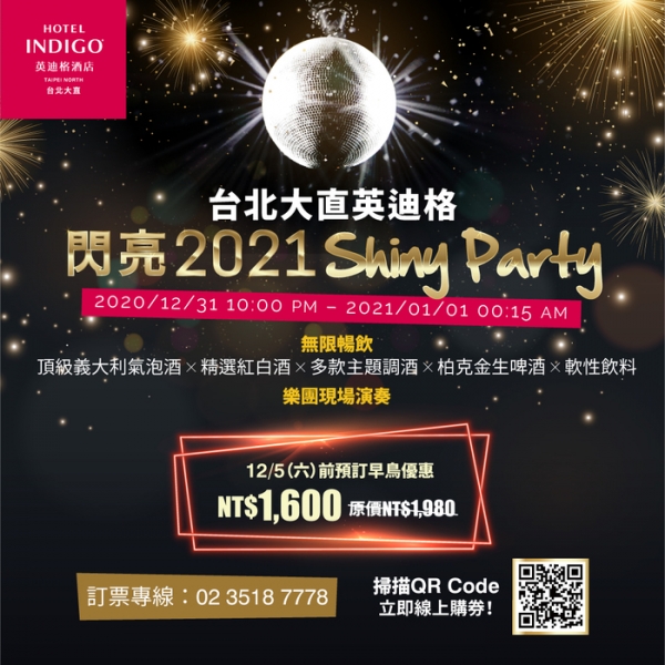 「閃亮2021」住房專案:只要透過官網或電話訂房,選擇房型後於12/31,並點選《Shiny 2021》住房專案,就可享加1元多一晚,再加碼送跨年派對入場券2張與每日早餐!