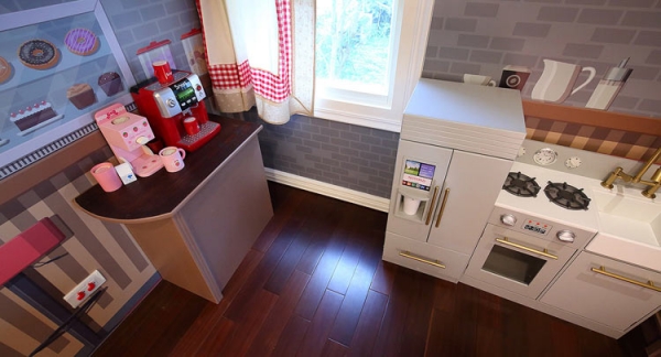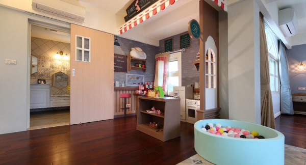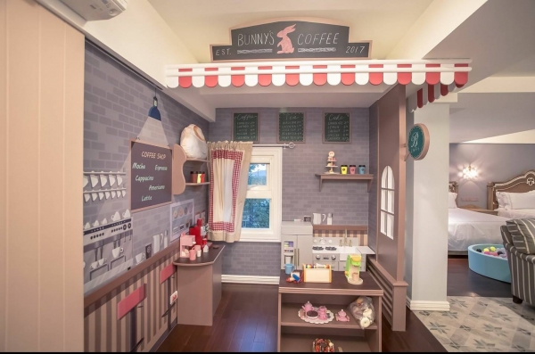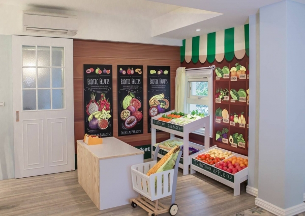 家家酒蔬果超市小孩兒的夢幻遊園地,獨居一樓的唯一房間,以歐洲街角蔬果店為設計概念,仿真的自然果物,讓寶貝們玩起扮家家的美好時光。