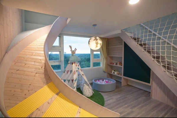 閣樓冒險溜滑梯! 享受俯衝而下的瞬間快感,是一圈一圈不斷地拾階而上也不覺得膩煩,仰躺在閣樓的窗,晴空無雲的時候,還能看見滿天星斗,那便是孩子對幸福的無限想像。