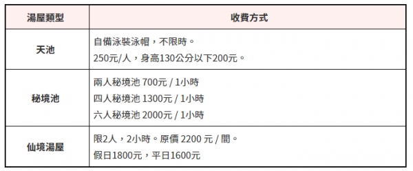 如果沒有打算過夜的也有單純泡湯的方案,公共泡湯池有三種類型,包含天池、秘境池以及仙境湯屋,以下有收費方式以及泡湯時間。