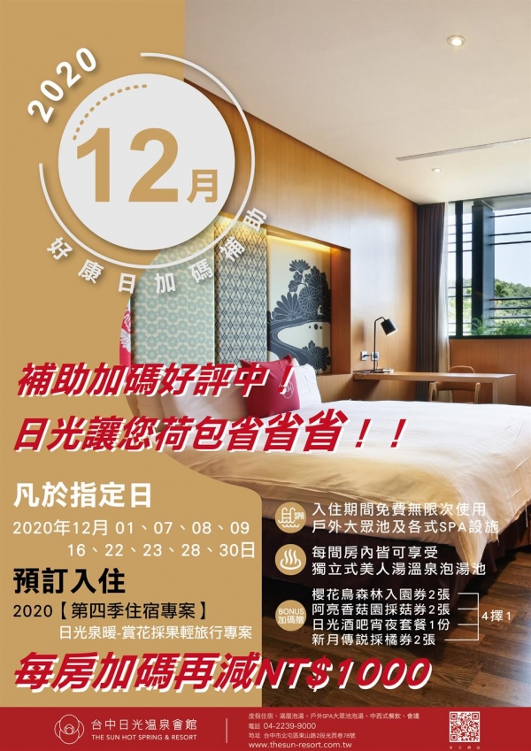 12月有「賞花採果輕旅行專案,指定日每房再折價新台幣1000元!