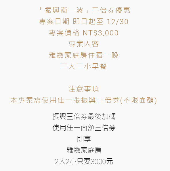 振興券還沒用完的朋友注意啦!飯店最後加碼好康,即日起至12/30推出「振興衝一波」住房專案,只要拿不限面額的振興券三倍券,不分平假日「一家四口」就可以3000元爽住雅緻家庭房一晚,換算下來等於每人只要750元,還能免費享用2大2小自助早餐,簡直超划算!