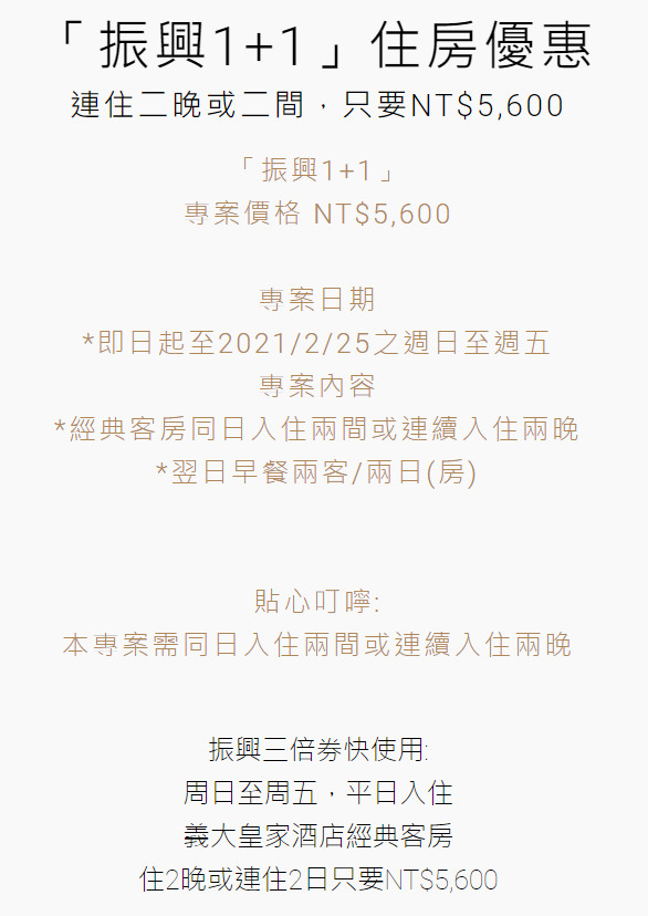 另外還推出了「振興1+1」住房專案,買一晚送一晚的好康延長至2021/2/25都能用,平日周日至周五入住經典客房2間或連續入住2晚,平均每房每晚只要2800元(包含早餐及服務費等等)!