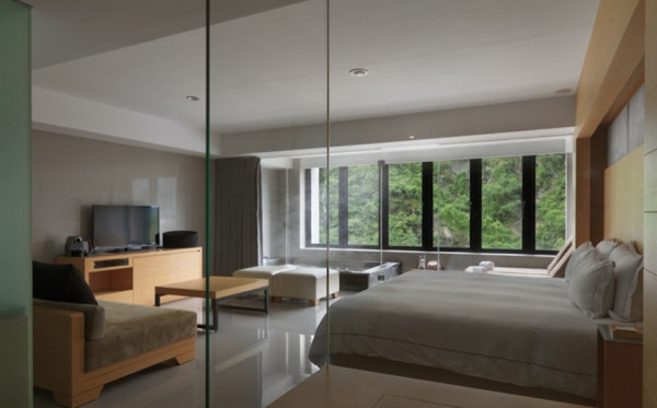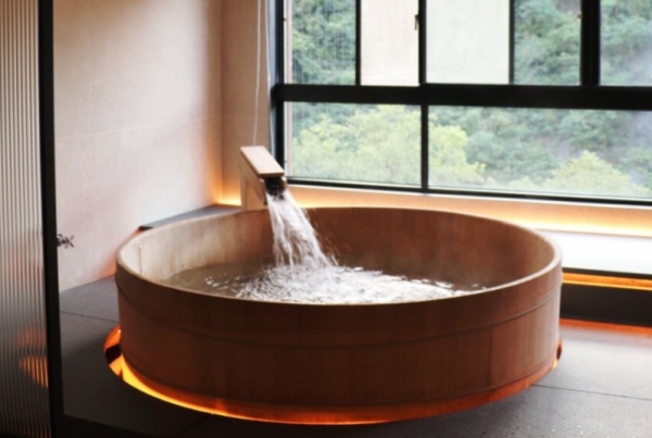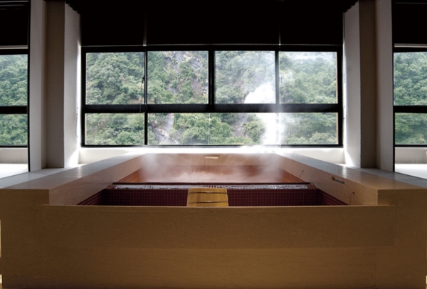 超大圓形檜木湯池,大面積的景觀窗可以直接欣賞到,潺潺流水與壯麗的山林景致!溫泉會館裡也有餐廳,享受完泡湯!也可以前往餐廳享用美食佳餚!