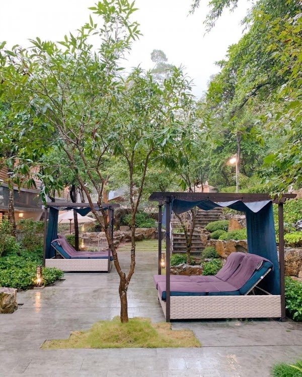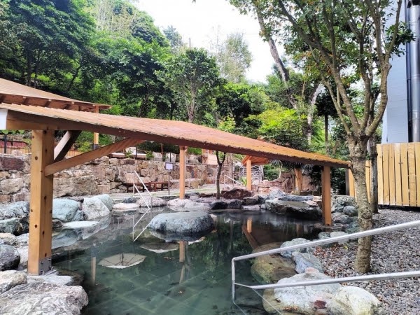 露天湯池有3座不同溫度的泡湯池,採男女混湯,須著泳裝才能入場,泉質為碳酸氫鈉泉,也就是俗稱的「美人湯」,休息區還貼心地擺放了躺椅、發呆亭等等,讓你盡情沐浴在大自然中,好享受啊!
