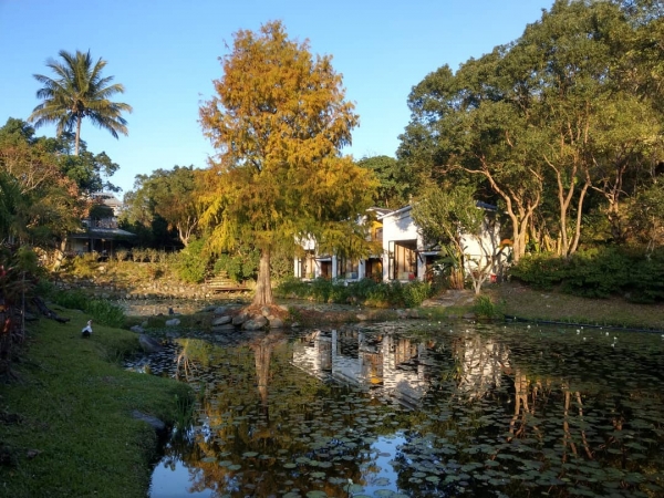 後湖水月坐落於四面群山擁抱的谷地裡,旁邊緊鄰無際的太平洋,谷地因為富含終年不竭的湧泉,原來是一大片的梯田農塘,因此後湖的園區內依照原本"梯田式"的地形造景,打造一階一階的池塘,恢復以前"水梯田"的景觀。