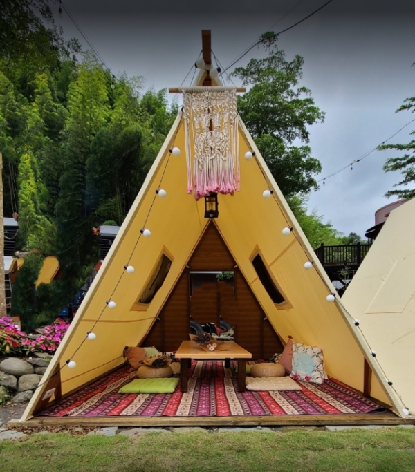 這棟主建築為餐廳,提供小火鍋、輕食小點心等等,夏日比較建議在室內用餐,有冷氣比較舒適,戶外也有超可愛的小木屋座位區,以野餐形式設計,三角帳篷的樣式超好拍,還有夢幻裝飾在周圍,怎麼拍都可以!