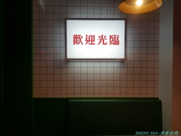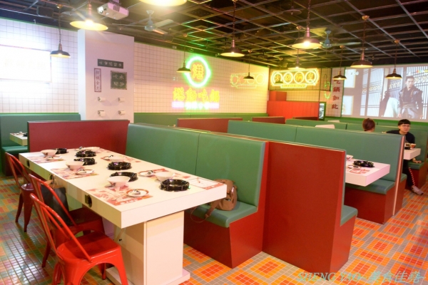 綠皮沙發椅、白磁磚牆配上五顏六色的閃閃霓虹燈招牌,