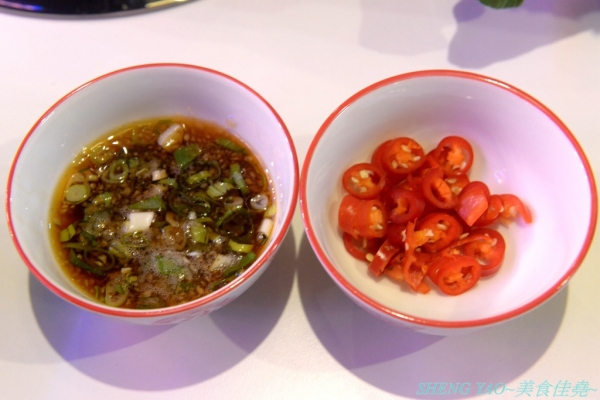 左邊是加了蒜、醋、蘿蔔泥的沾醬,右邊是辣椒,
