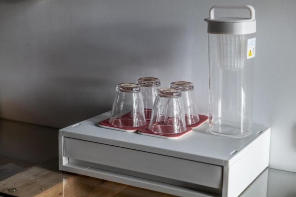克肥內採用無印良品系列的家具,女生最在意的就是吹風機!還可以免費借用 Dyson 吹風機全套造型組!從抵達旅館開始,就會感受到用心的服務,進門服務人員就會送上每人一小杯迎賓飲料!是接骨木花梅果凍,清爽順口的滋味!