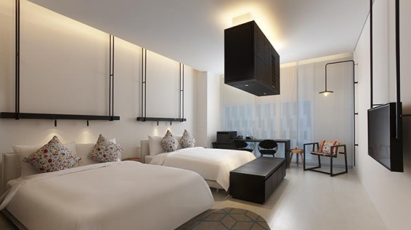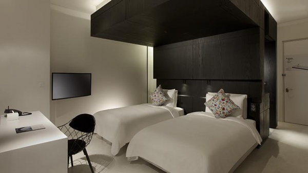 黑色與白色是台南老爺行旅的基底。一踏入客房,映入眼簾的是大片的白色木質地板以及留白的牆面,勾勒黑色木櫃線條,房間的主視覺悄悄浮現。點晶式的設計備品:杯盤、收納袋、文具盒以特殊色彩連結,藉此傳遞台灣南部著稱的熱情文化。