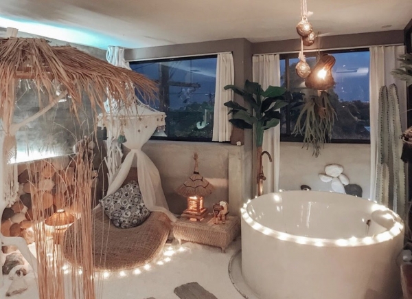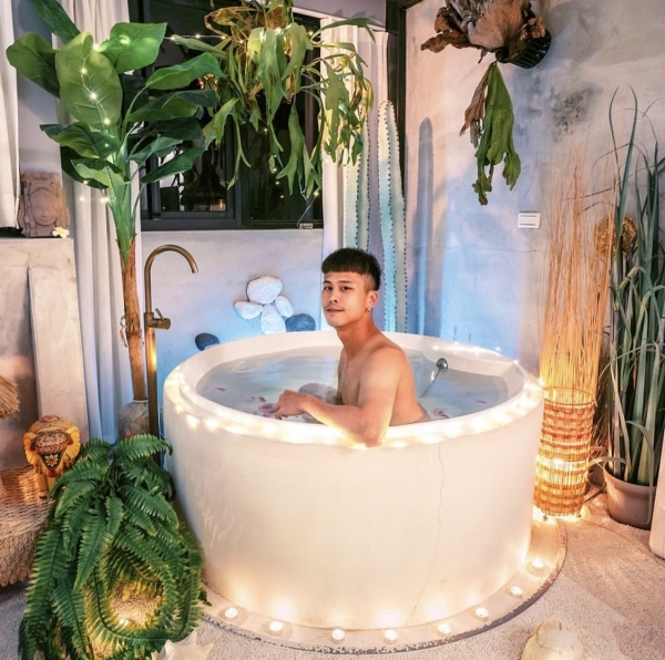 房間內就有一座圓形的浴缸,直接在房內泡澡!南洋風的裝潢讓你置身在國外沐浴的感覺,最特別的就是衛浴設備,蓮蓬頭選用了韓國的香氛濾芯,讓沖出來的水都是香的!洗完全身滑溜又超香的,洗澡都是一大享受!