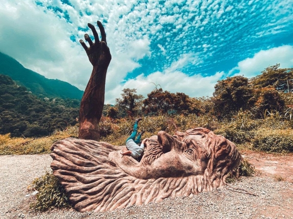 原雪山花園農場,這巨人則是當時園區內的巨型雕塑,在廢棄了20年後,才形成只露出頭,巨大手的聳動面貌!