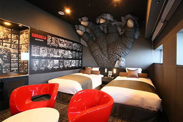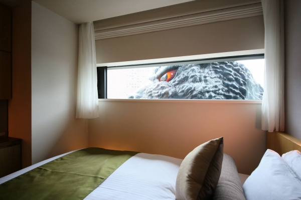 飯店內最熱門也最難搶的就是哥吉拉的主題房,不僅房內就有一隻超巨大的哥吉拉陪你入睡,床頭更有哥吉拉的手掌從牆壁冒出來,搭配聲光效果更可怕!也期待台北館有更多不同的哥吉拉設施!