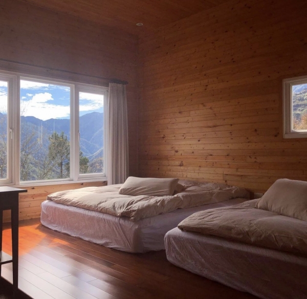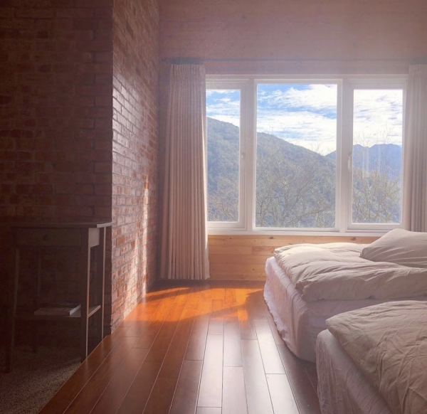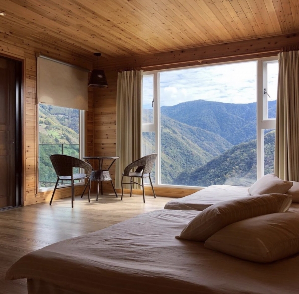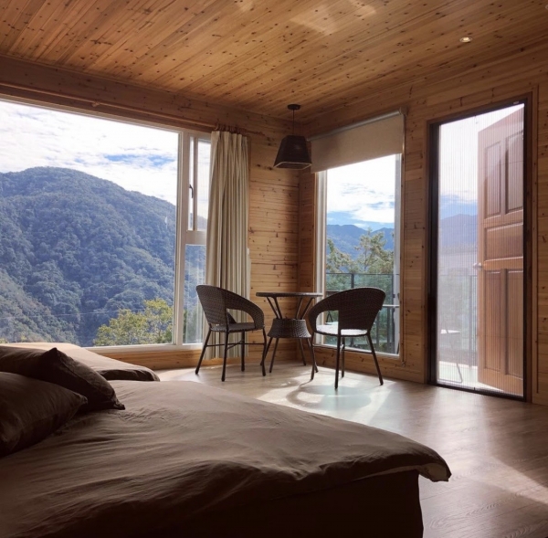 以自然、簡約、樸實為空間的設計主軸,原木空間搭配樸實的紅磚牆,提供乾淨柔軟的高級寢具,簡約的傢俱擺設,搭配大面積的觀景落地窗,躺在床上就可以欣賞戶外壯麗山景與夕陽、雲海、星空、和彩霞共譜一段大自然戀曲!