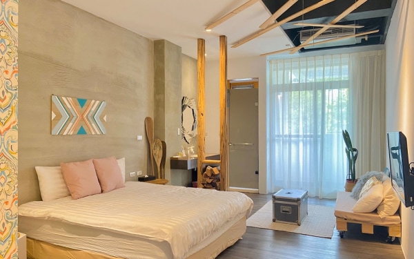 以簡潔白牆呼應清水模,挑高7米玻璃引進自然光,讓在地文化與流行時尚結合,找了老木頭來增加空間溫度,用溫潤溪石沉澱起伏的心靈,空氣還散發著金龍山杉木的香味!民宿不接待6歲以下孩童,7歲以上需要加床!