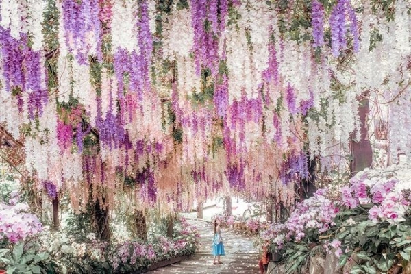 最熱門打卡點還有這絕美的子瀑布~滿滿的紫藤花粉色紫色的花垂降下來,有如瀑布般,但其實仔細看會發現它不是真花喔!是去年農場二女兒結婚時的布置,沒想到流傳開來就成為了打卡聖地!