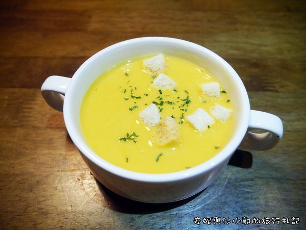先上桌的是南瓜濃湯,濃郁口感。