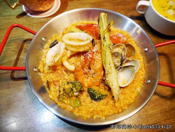 紐澳良海鮮飯,這種雙耳薄鐵鍋是源自西班牙,又稱為Paella,以此鍋所煮出來的米飯料理就以Paella命名。