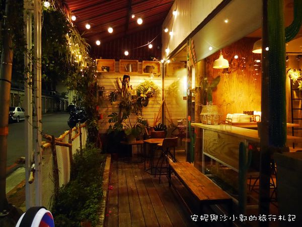 店外觀掛著一些植物,和燈泡串在夜裡點綴,帶有獨具浪漫。