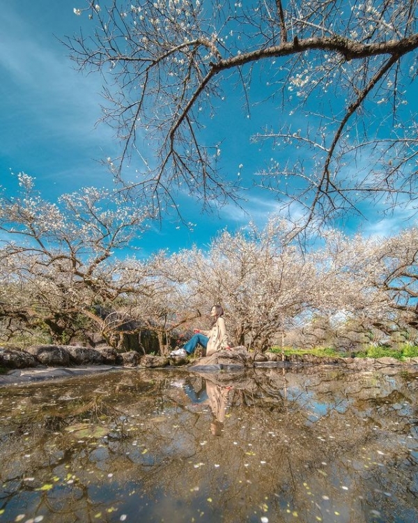 園區主人特地在園區正中央設置了水池造景,當周圍白色梅花倒映在水中時,宛如絕美的「梅花版天空之鏡」,雪景般的場景超夢幻,拍膩了一般海邊的天空之鏡就來這邊打卡朝聖一波吧!