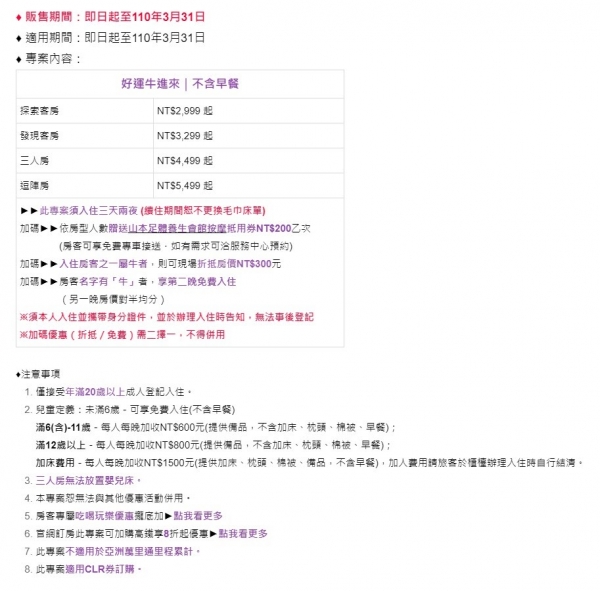 為了迎新年,即日起至3/31還新推出「三天兩夜 好運牛進來」住房專案2999元起,只要名字有「牛」的人就能免費入住一晚,等於1499元就能雙人爽住兩晚啦!而生肖「屬牛」的人也能憑身分證折抵300元,享2699元起入住兩晚,每人每晚只要675元起!快揪身邊屬牛或名字有牛的朋友搶好康啦!