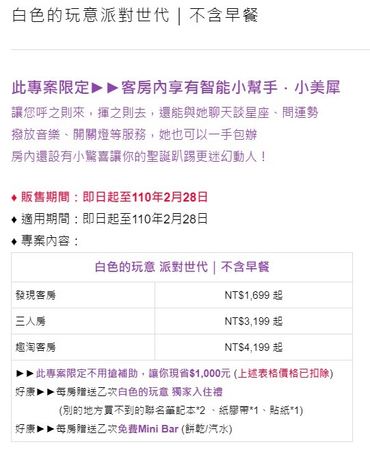 飯店即日起至2/28推出了「白色的玩意 派對世代」住房專案,讓你直接現省1000元,雙人入住智能AI主題房(含稅)只要1699元起(原價為2699元起),等於每人每晚850元就能爽住,還能免費吃零食飲料及獨家入住禮!