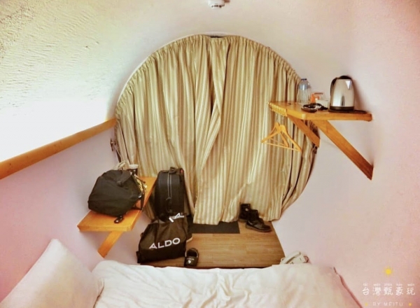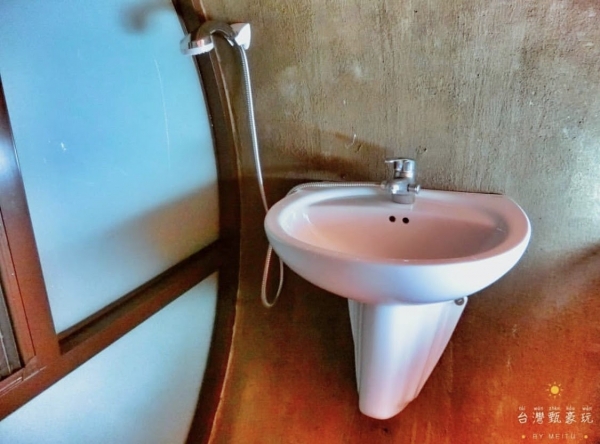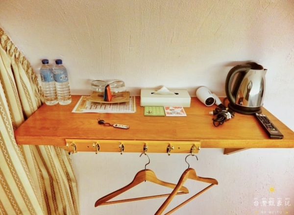 小巧的房間內甚麼都有,還有可以讓你吊衣的地方!水管屋內備有熱水壺可以自行煮水,到服務台區就有飲水機可以裝,南投知名的日月潭紅茶包、吹風機、礦泉水!基本的設備都有提供,包含獨立的衛浴設備!以往的水管屋都是要使用公共衛浴,在這裡不用跟其他人搶!