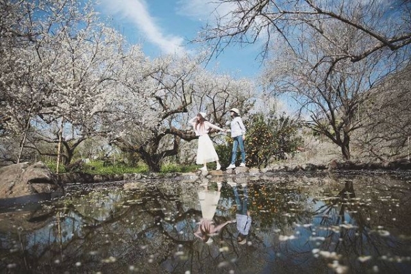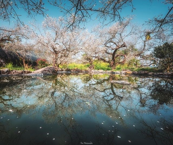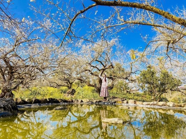 園區正中央還特地設置了一水池造景,當周圍的梅花樹倒映在水面上,形成上下顛倒的絕美畫面,有如梅花版的天空之鏡!怎麼拍都超美,彷彿來到仙境一般!