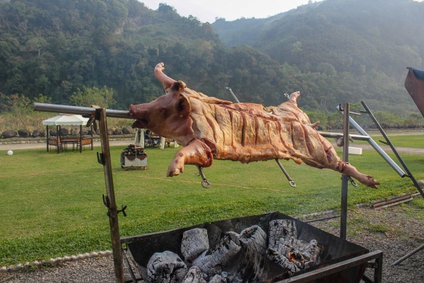 烤大豬為原住民傳統燒烤,以新鮮溫體山豬全豬作為燒烤,使用龍眼木及相思原木炭火,以熟練的火候將全豬烤至金黃焦香,慢火鎖住肉汁,搭配特製胡椒粉,強調原始風味及其特殊口感,讓你一口接一口!