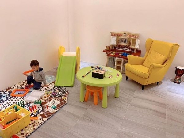 位於一樓的公共空間非常寬敞,有沙發區以及閱讀區,甚至有提供桌遊可以玩,也不用怕孩子沒地方跑,民宿B1有設置兒童遊戲區,滑梯、帳篷、扮家家酒通通有,絕對是親子泡湯放鬆的好去處!