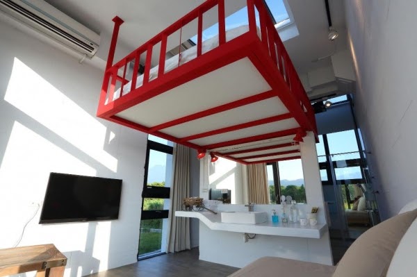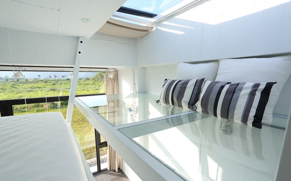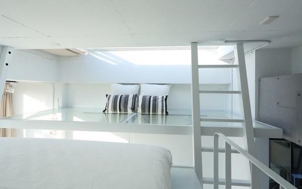 Z字型的床舖設計,簡約白及透明玻璃的閣樓有夠時尚,廁所以大片拉門做隔間,粗獷味十足,衝突的美感達到一種微妙的平衡!
