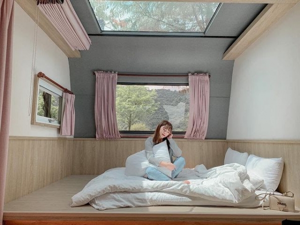最棒的就是露營車除了側邊的窗戶可以欣賞梅花湖畔外,還有超大天窗,讓你夜晚躺著數星星,皆有附窗簾,獨立的住宿空間,寬敞又舒適,還能依自己喜好裝飾專屬你的露營車!