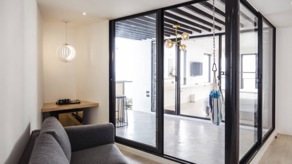 擁有絕佳海景視野的雙人房!一走進房間便能看見大片落地窗,看出去就是無敵海景,房內以純白色與原木色調為設計,浴室外更漆上寶藍色的油漆,顯眼卻超有質感!