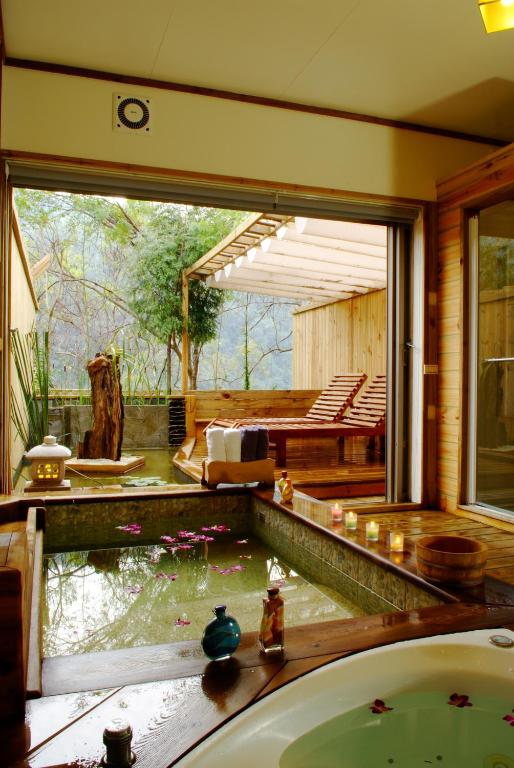 有五種泡湯房型,從日式風呂到帳棚湯屋都有,泡湯時打開落地窗,讓大自然與沐浴SPA池合成一體,一邊觀山雲霧繚繞,一邊聆聽潺潺流水聲及鳥鳴山幽,享受大自然的饗宴放鬆身心靈!