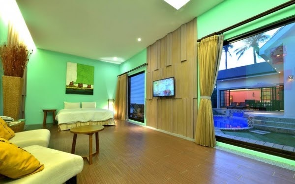 房型風格偏向東方美,亮黃色的牆壁非常吸睛,戶外的圓形大泳池則呼應房型的名稱:在鏡面無邊的泳池裡,瀰浮月亮,是不是很詩情畫意?入內之後明亮的黃色牆面更是讓人印象深刻!