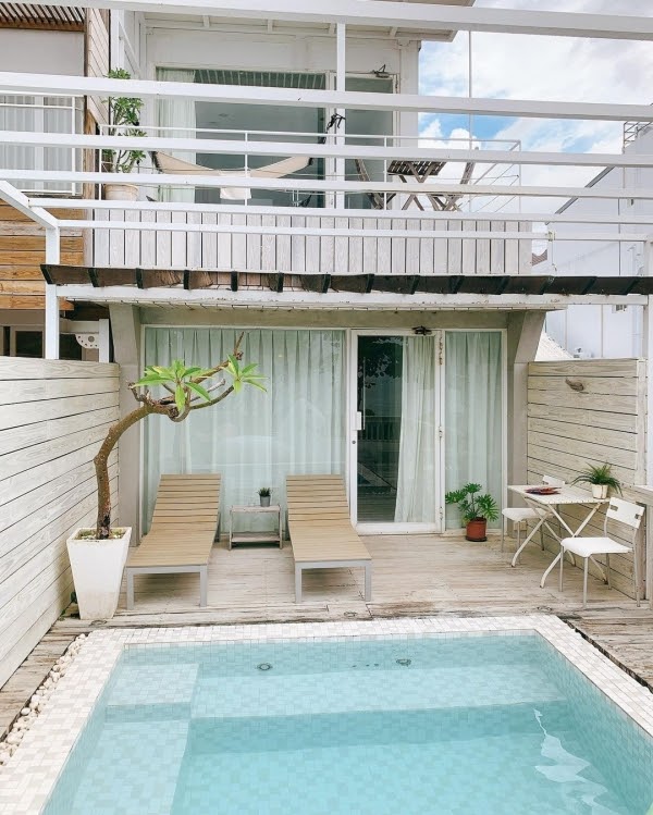 一旁還附有獨立浴缸及私人露天泳池,更有躺椅可以愜意地躺著休息,不管是親子同遊或情侶度假都好適合啦!