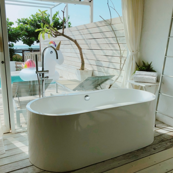 房外還有個小露台,附有按摩浴缸,讓你可以一邊泡SPA一邊欣賞海景,更能坐在這邊愜意地享用早餐,看得小編我現在就想收拾行李去墾丁玩了啦!
