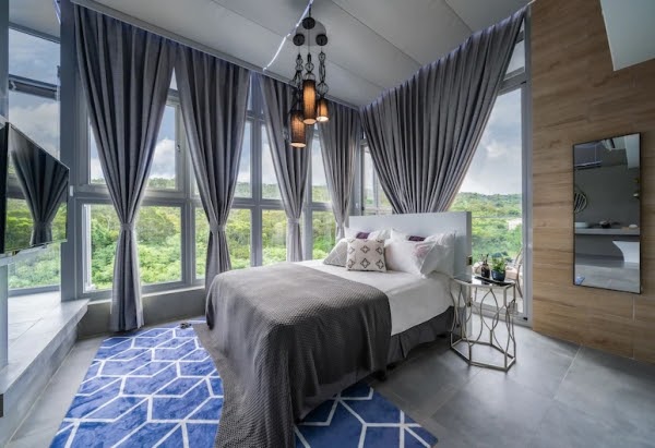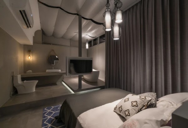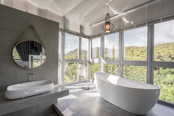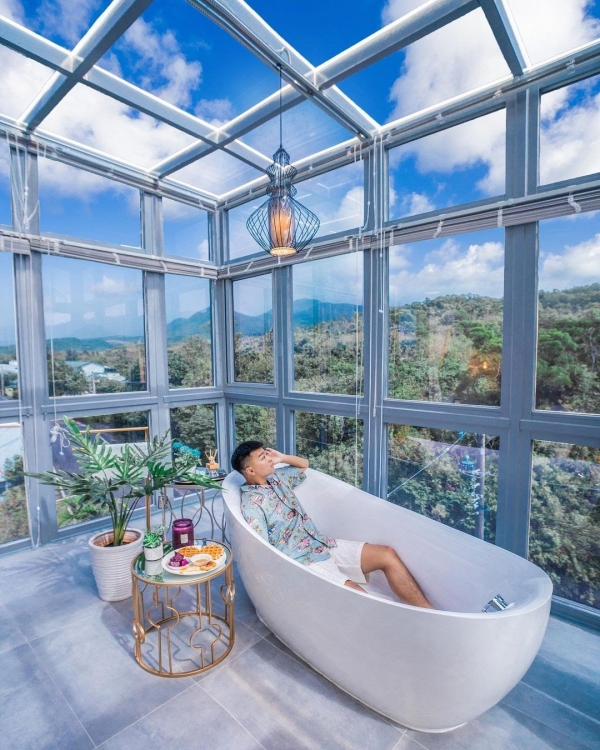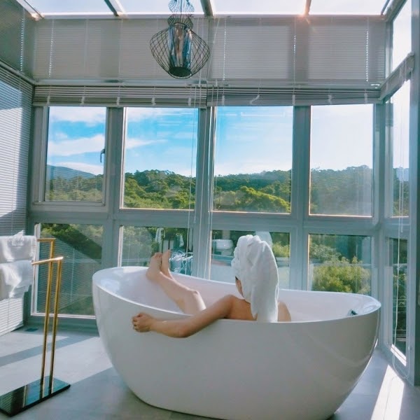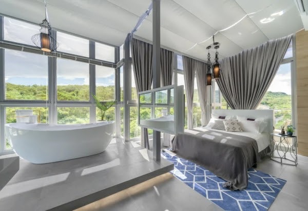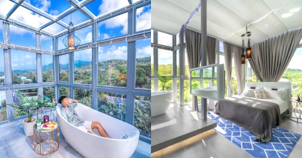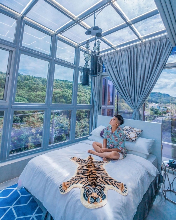 最吸睛的房型非這間莫屬啦!房內採無隔間設計,滿滿的挑高落地窗讓人擁有超廣角視野,一旁還附有1.8米大浴缸可以享受泡澡,天花板上甚至還有電動窗簾,讓你夜晚躺著就能看滿天星空!