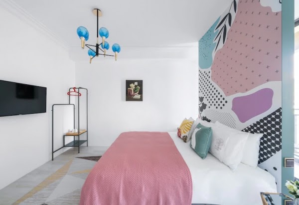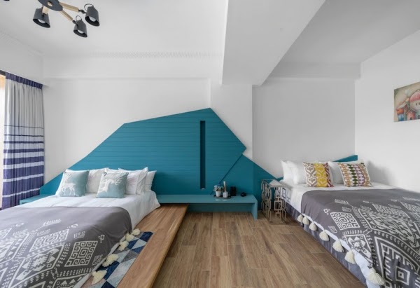 色彩繽紛的雙人房,採用多種色塊及圖樣拼接而成,讓純白極簡的房間增添了可愛感,少女心簡直要噴發啦!