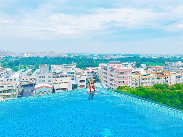 再來就是整間旅宿的重頭戲啦!位於頂樓這座絕美無邊際泳池,許多網美都是衝著它來的,不僅可以飽覽整個嘉義市景,夜晚還會搖身變成N23.5 LOUNG酒吧,一邊喝酒一邊賞百萬夜色,根本人生一大享受啊!