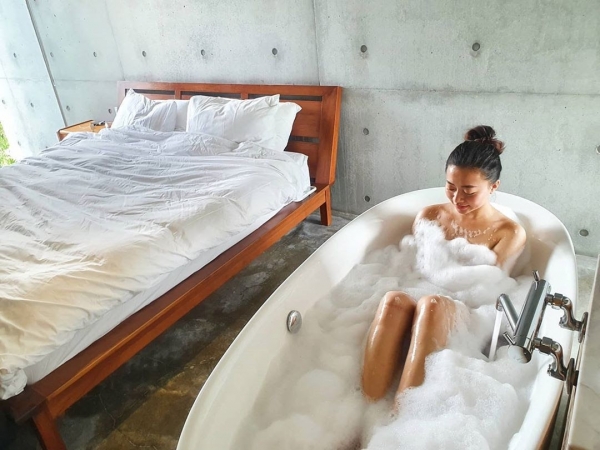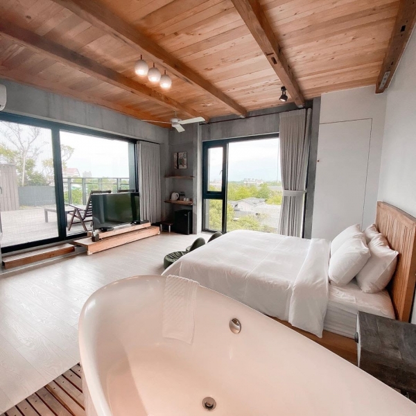 半開放式衛浴也是這間民宿的最大特點,除了有一般的透明淋浴間,還有浴缸,不過浴缸的位置不再浴室哩,而是在床旁邊!特別又舒適,可以留下一段獨特的回憶!