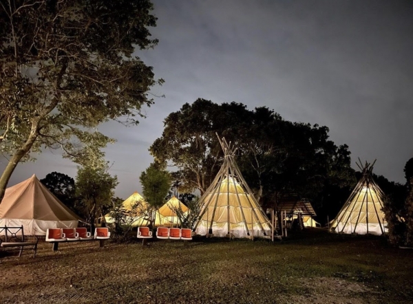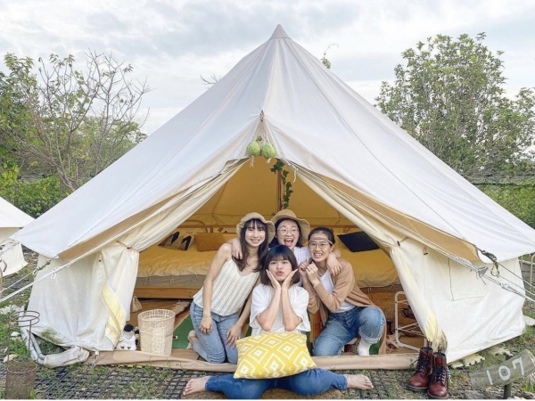 橘舍三食共有5個露營區,一共有32帳!豪華露營區包含5頂四人帳與2頂雙人帳,帳棚內都有冷暖氣空調和波西米亞風的裝飾!不只露營區還有小朋友最愛的沙坑區及樹屋,來到營區也不用擔心吃的問題!
