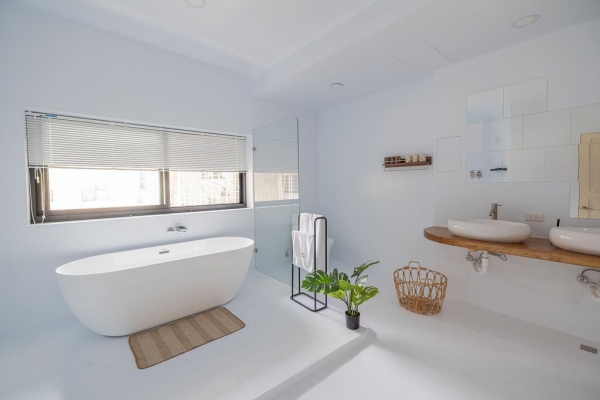 總共有三張雙人床,整層無隔間設計,純白的裝潢,很清新舒適,衛浴也是以透明玻璃門,還有超Q蛋形浴缸可以泡澡,絕對是情侶約會、閨密同遊的好住所!